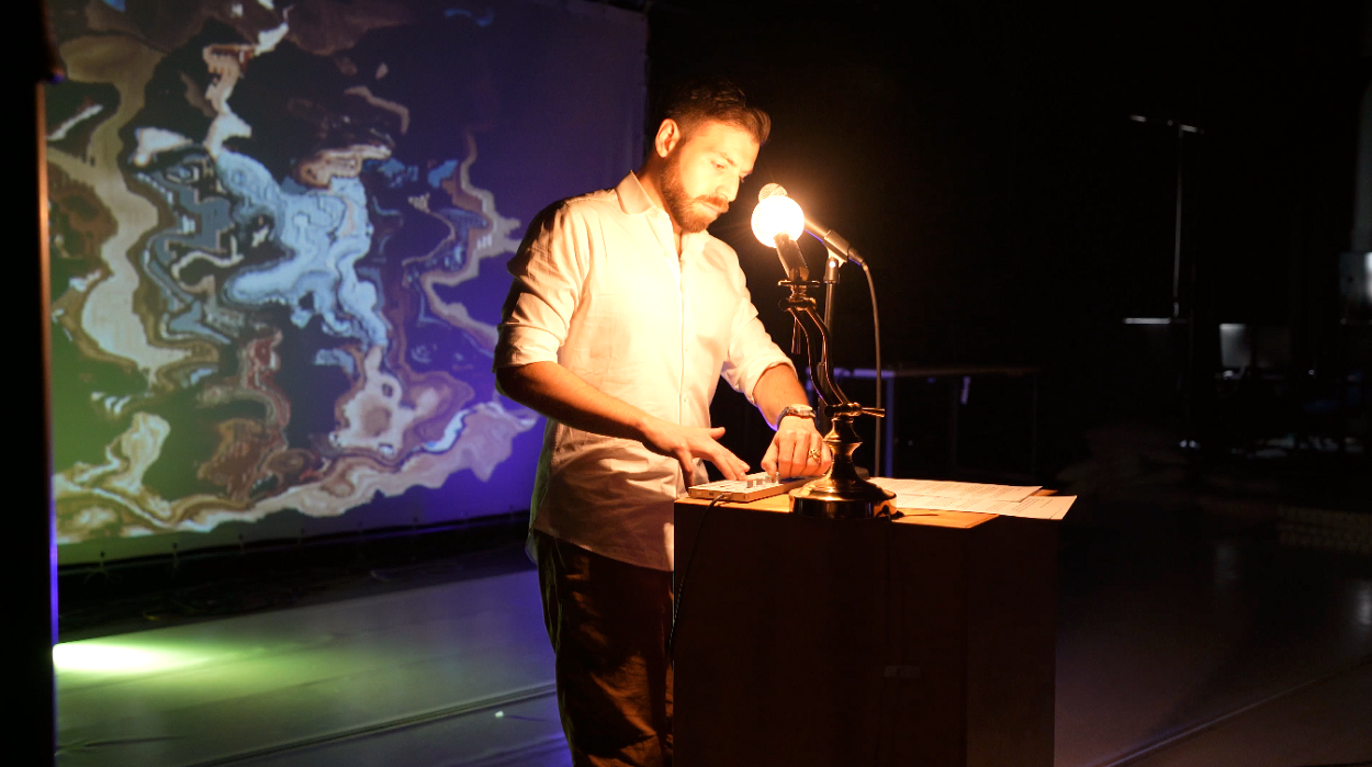 Note: the animated images projected during this performance are being generated in real-time using the signal from the synthesizer played onstage to ping a neural network trained on the same ImageNet dataset discussed in the performance.